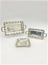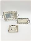 TWO GRADUATED MEXICAN SILVER TWO-HANDLE TRAYS AND SQUARE DISH WITH CENTRAL FLORAL CLUSTER MOTIF. Larger tray, overall 17 in. Wt. 57.4 troy oz. Property from the Estate of Erich G. Holzapfel, Washington, DCEstimate $500-700