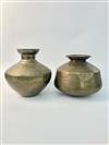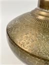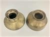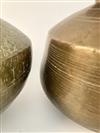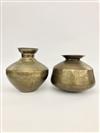TWO MID-EASTERN BRASS POTS. One with punched floral and geometric decoration; other with horizontal ribbing. Taller, H: 11 1/2 in.Estimate $150-200
