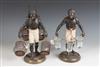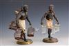 TWO PETIT CHOSE PAINTED BRONZE/BRASS BLACKAMOOR TABLETOP FIGURES. One, carrying three glass vessels; the other carrying five bird cages with doves - H: 13 3/4.Estimate $300-400