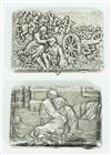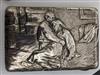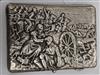 TWO RUSSIAN SILVER (84-FINE) RELIEF-DECORATED CIGARETTE CASES. One, made Moscow, 1908-17, with scene from painting by Ilya Repin, depicting Ivan the Terrible after he murdered his son in a rage; other, depicting a battlefield scene with soldiers, cannon, wounded soldier and nurse. Larger, 4 1/2 in. x 3 1/4 in.; wt. 15.6 troy oz. Property from the Estate of Erich G. Holzapfel, Washington, DC Estimate $600-800