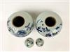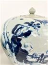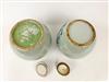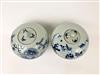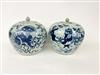 TWO SIMILAR 19TH CENTURY CHINESE LIFT-COVER APPLE-FORM PORCELAIN JARS . Blue and white figural decoration on celadon ground. Larger, H: 9 1/4 in.Estimate $100-200