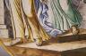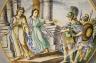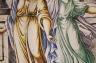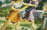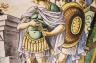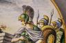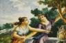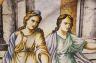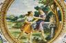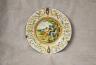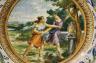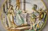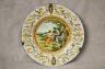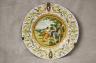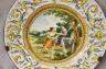 TWO SIMILAR ITALIAN FAIENCE STYLE CERAMIC CHARGERS WITH POLYCHROMED MYTHOLOGICAL SCENES Larger, D: 16 1/4 in. $200-300