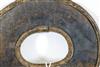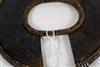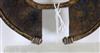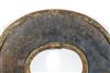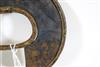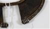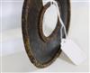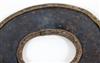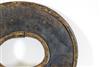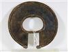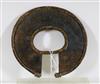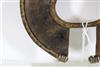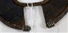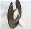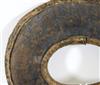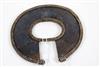 UGANDAN KARAMOJA TRIBAL PEOPLE FIGHTING WRIST KNIFE, Mid-to-late 20th century. Patinated and used hand wrought iron and copper (and leather) Karamoja Tribal People wrist knife used by a Karamojong Dodoth warrior to cut meat or as a weapon. Acquired while consignor worked in Uganda. - Diameter: 5 inches. Estimate $80-120