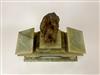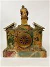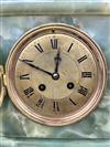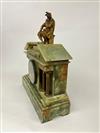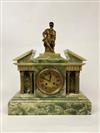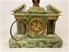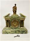 VICTORIAN GREEN ONYX ARCHITECTURAL MANTEL CLOCK. Mounted with metal Renaissance figure. WIth key. H: 19 in.; W: 15 5/8 in.Estimate $150-250