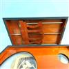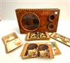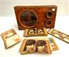 VICTORIAN INLAID BURLWOOD STEREOSCOPE WITH VIEWING CARDS. Rectangular case with zebra-striped edge banding; app. 60 viewing cards including American and European scenery, and figural humor scenes. Stereoscop, 14 in. x 8 in. Estimate $150-250