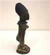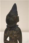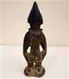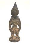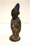 WOODEN FEMALE ABEJI DOLL YORUBA NIGERIA . Early-to-mid 20th Century. Patinated single wooden Ibeji Doll; Yoruba Tribe, Nigeria. Female Eyes carved but she lacks a nose, mouth or ears; body and base was once painted red, hair painted blue; blue and red glass necklace. Signs of usage and handling. - Height: 8.75". Estimate $400-600