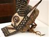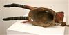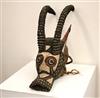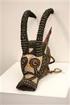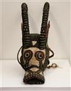 WOODEN NOUNA UPPER VOLTA BUFFALO LIKE MASK. Patinated Upper Volta Buffalo like creature mask. It has two horns and two pointed ears, colored black, red and white. Black is pitch. Signs of usage and handling. - Height: 22". Estimate $1,000-1,200